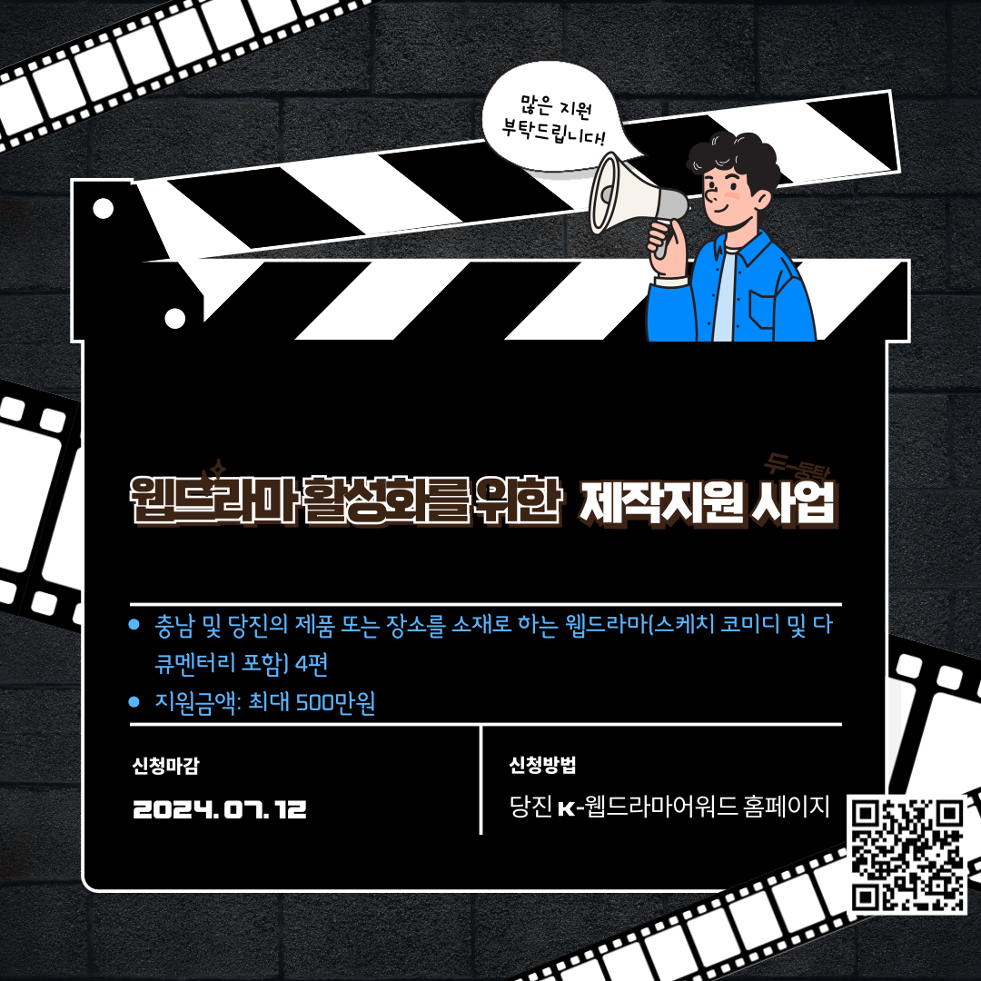 본 지원사업은 웹드라마, 스케치 코미디, 다큐멘터리 등 다양한 형식의 영상 콘텐츠 제작을 지원하며, 4편의 작품을 선정할 예정이다. 지원 대상은 영상물 제작 또는 홍보 등의 사업을 영위하는 개인사업자 또는 법인사업자로 제한되며, 지원 신청은 2024712일까지 당진 K-웹드라마어워드 홈페이지를 통해 가능하다.